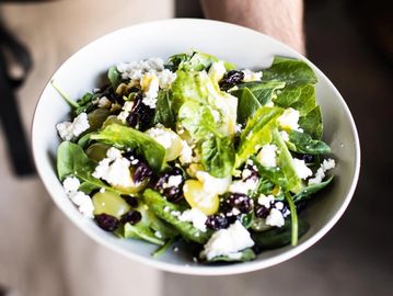 MIX DE LECHUGA, ESPINACA, ARÁNDANOS, QUESO DE CABRA, UVA VERDE Y HONEY MUSTARD.